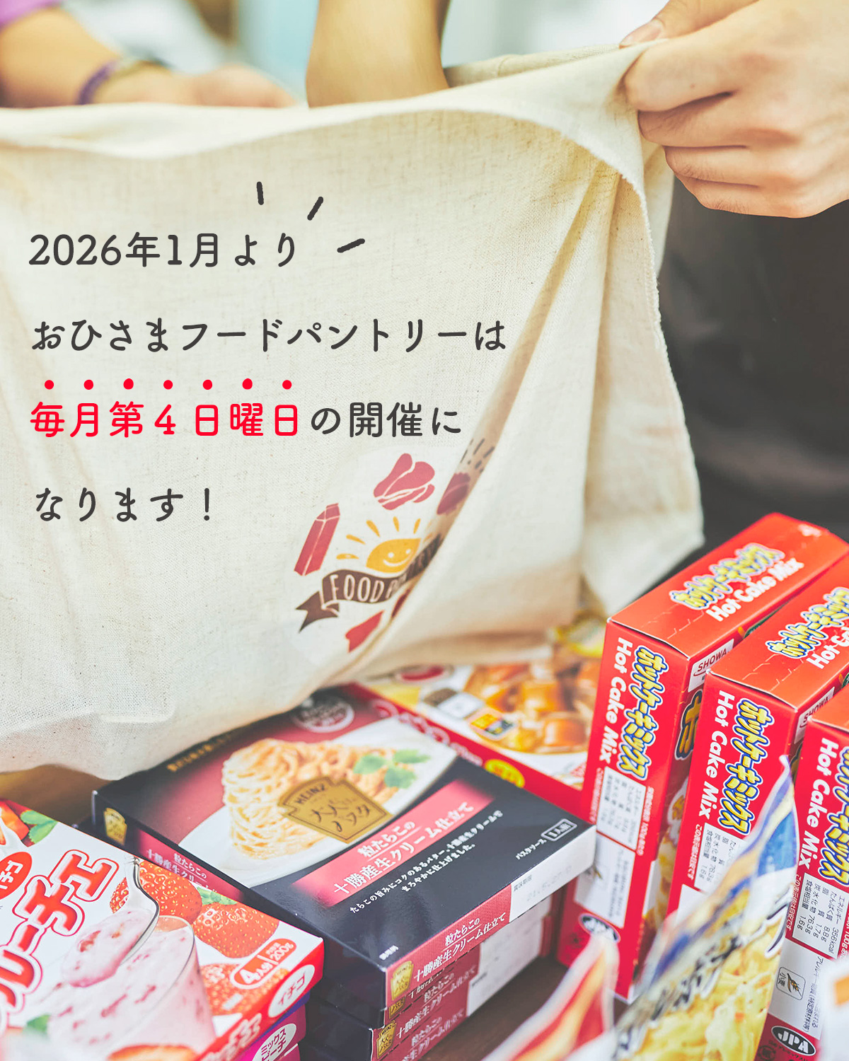 2025年12月は14日(日)の開催とお知らせしておりましたが、12月21日(日)の開催に変更させていただきます。クリスマス時期に合わせた食品を用意する予定なので、参加資格をお持ちの方はぜひご参加ください。
